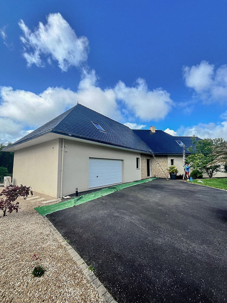 Pour cette réalisation à Landivisiau, notre équipe a suivi un processus minutieux. Tout d’abord, nous avons nettoyé en profondeur la toiture afin d’éliminer les mousses, lichens et autres saletés. Cette étape est cruciale pour garantir l’adhérence et l’efficacité du traitement hydrofuge.